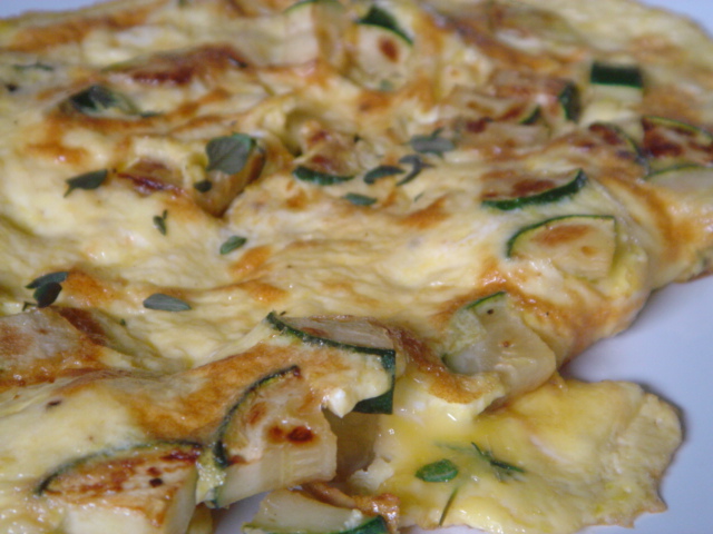 3. Lower heat, pour beaten eggs over zucchini, then sprinkle with thyme leaves.