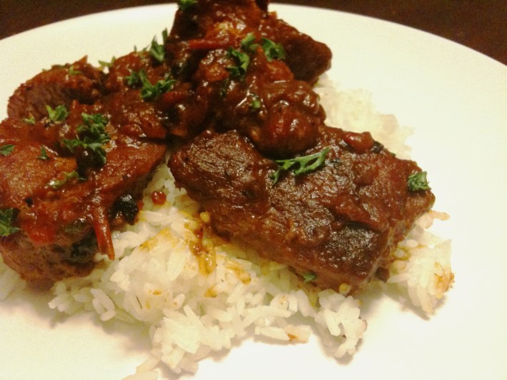 4. Add the seared pork, thyme, and bay leaves. Cover and simmer for 90 minutes until the ribs are fork tender, stirring and scraping the bottom of the pan occasionally to prevent sticking. Serve over steamed rice, topped with the parsley.