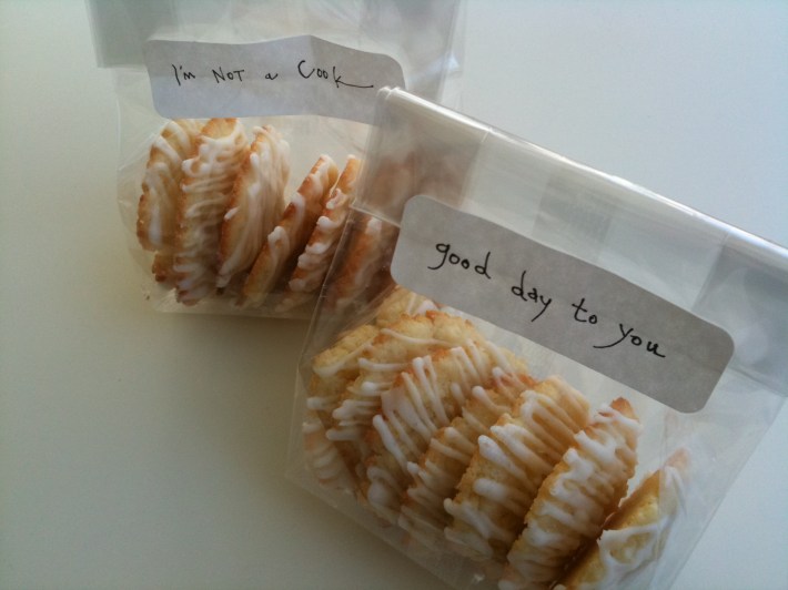 I enjoy making cookies in large batches, though I usually end up giving away more of than eating them. Instead of using plain old plastic sandwich bags to deliver them, I prefer to neatly pack them in cellophane bags. These bags are readily available and do not cost much more than the average zip-top plastic snack bag. Just an extra minute of effort delivers an immensely greater sentiment to my cookie recipients. I think it’s the little things like this that let them know I care, which makes their smiles that much brighter.