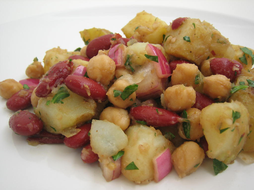 2. In a large bowl, whisk together extra virgin olive oil, balsamic vinegar, sugar, salt, and pepper. Toss the potatoes, garbanzo beans, kidney beans, and red onion together with the dressing. Allow salad to cool, then mix in the parsley until fully and evenly combined. Season with additional salt and pepper if desired.