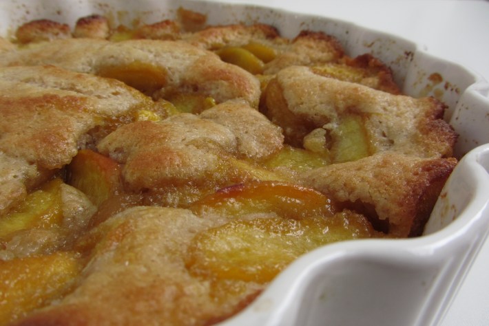 What I can say is: the peach is one of my favorite summer fruits. It has a great texture, and its mild sweetness appeals to a broad range of palates. Building a cobbler is simple and satisfying. It conveys your good intentions without requiring the finesse of cake-making. And the best thing about it? The customary scoop of ice-cream that goes with it!