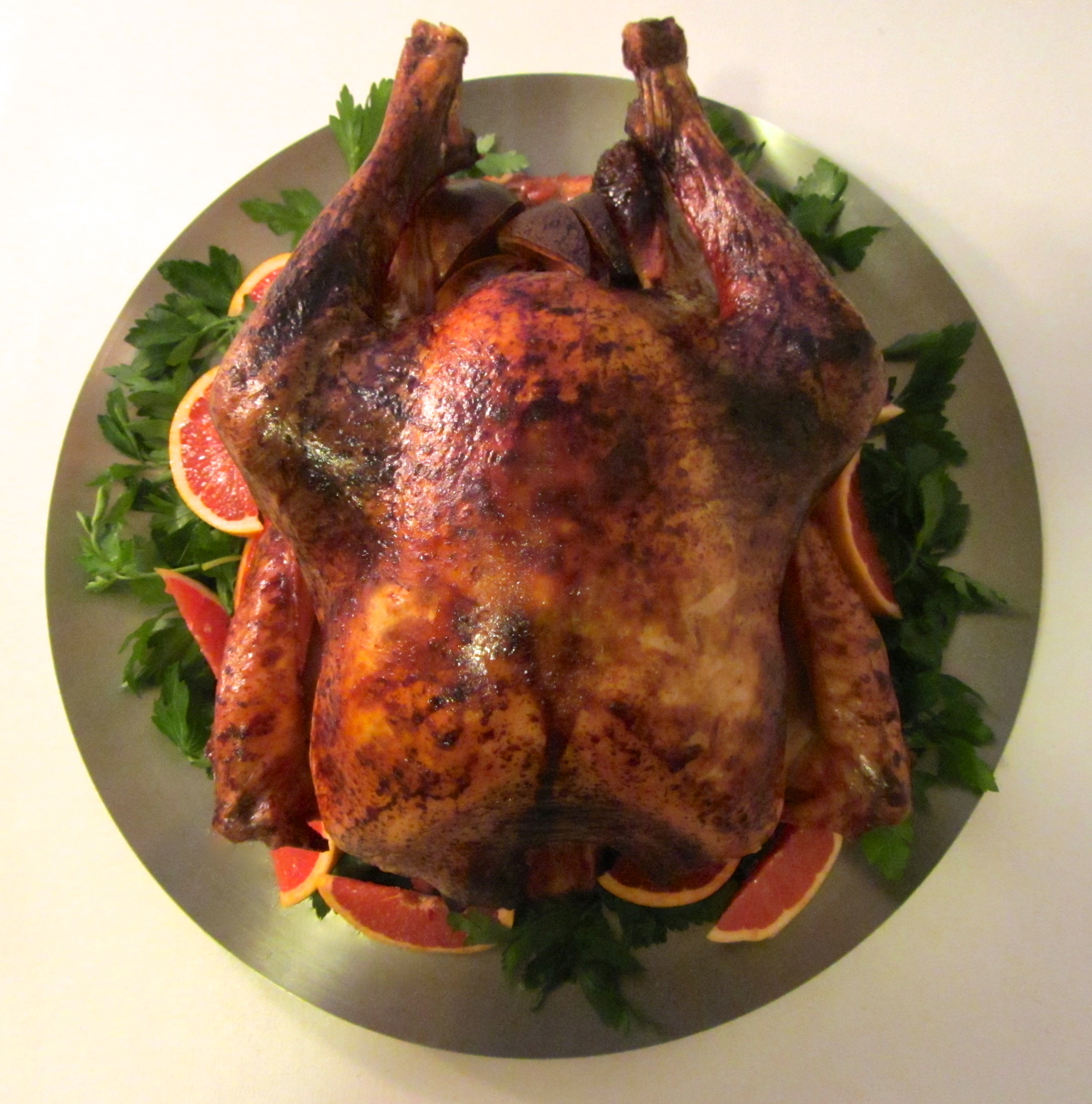 Turkey doesn’t have to be a traumatic ordeal. There are two crucial words to remember when making this holiday centerpiece: TIMING and BRINING. Timing: decide when you want to serve the bird and plan your time backward accordingly so you can move at an easy and efficient pace. Brining: this is a must! It is only one extra step in preparation and it makes a whole world of difference in keeping the turkey ultra moist. As far as presentations go, that is entirely up to you. In this case, I’ve placed the bird on a simple bed of parsley, surrounded by grapefruit wedges. The simpler, the better, in my opinion… after all the, the bird is the star, and she can be a Prima Donna!