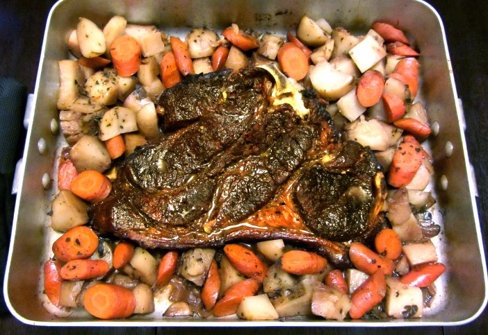3.  Once the steak is seared, transfer to a large roasting pan, place the potatoes and carrots around it, then sprinkle the oregano over the entire pan.  Cover tightly with foil and roast at 300F for 1.5 – 2 hours, until the meat is fork tender.  Remove from oven and allow to rest 5 minutes before cutting into large pieces to serve.  Be careful of hot steam when removing the foil cover.