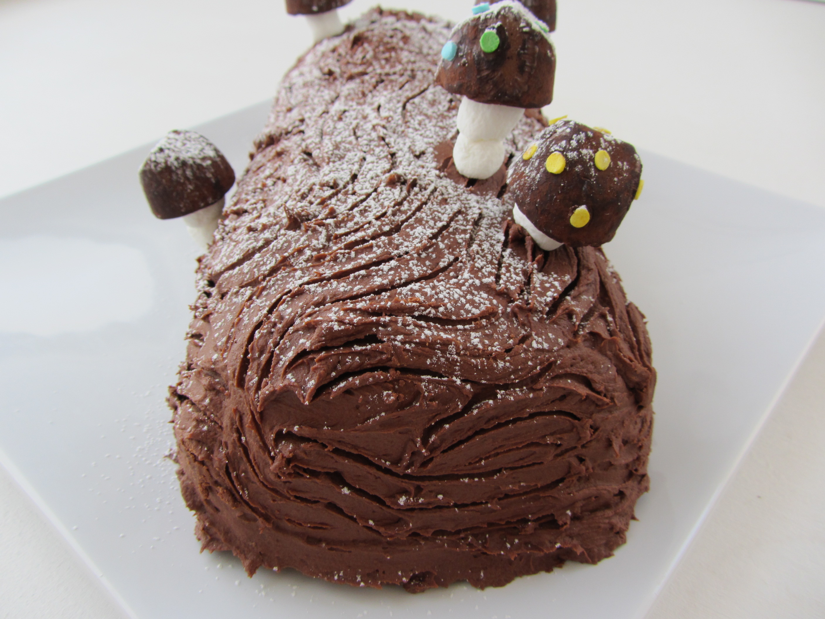 Literally translated, “Log of Christmas,” this traditional holiday dessert has roots that date back to ancient European traditions. It is fashioned to look like a yule log, which to celebrate the winter solstice, would be burned in the hearth for the twelve nights of the holiday season, and then kept in the home the rest of the year as a talisman to ward off misfortune. Nowadays, this wonderfully kitschy cake is a treat I look forward to making every holiday season. The yule log cake is a cream-filled rolled sponge cake traditionally covered in a chocolate ganache, and decorated with meringue mushrooms. I’ve adapted the formula so that we simpler folk can too make this delicious treat with our more readily available culinary skills. The result is still whimsical and just as sweet to eat!