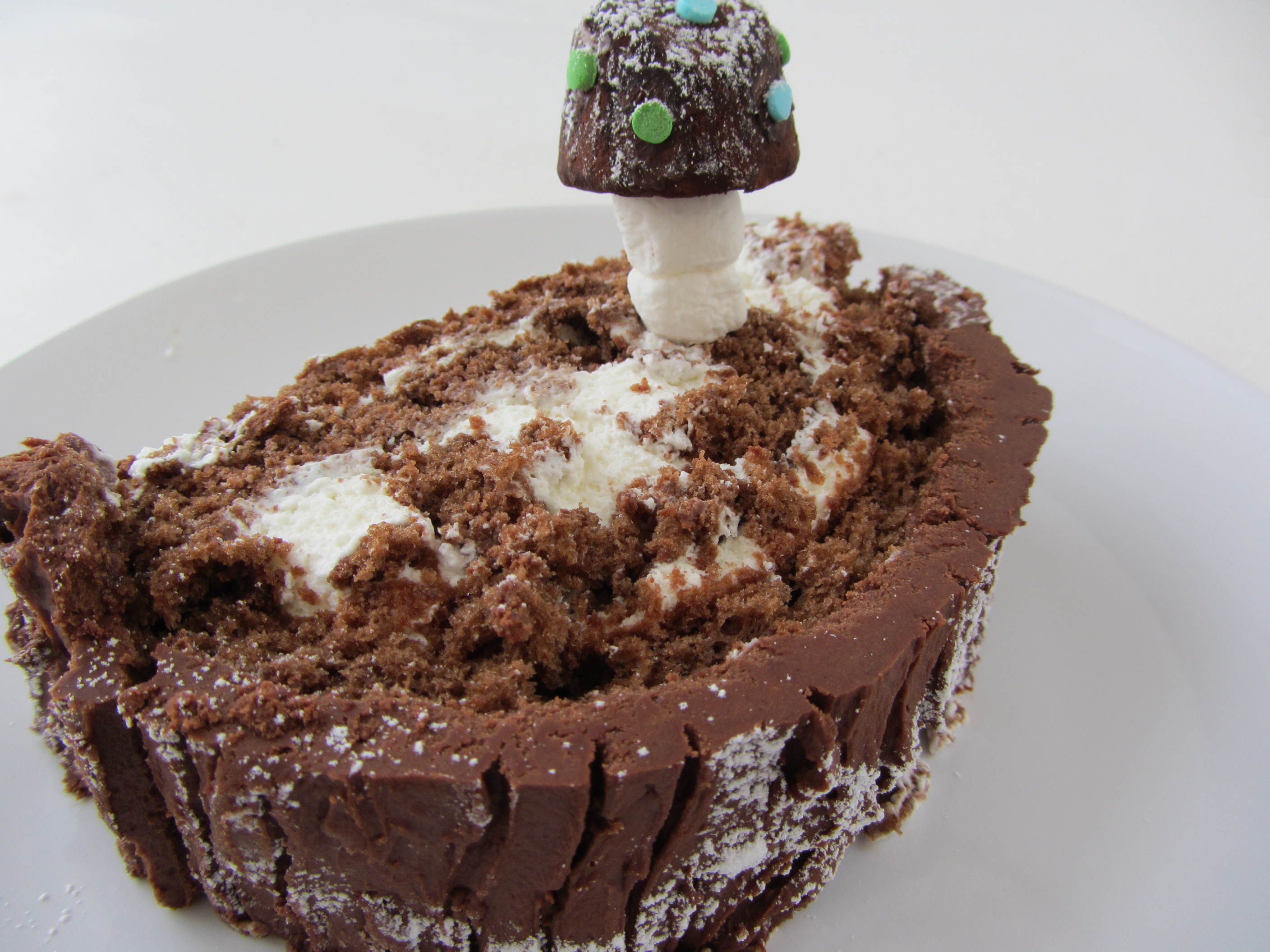 11. Create the mushrooms by threading a toothpick through one or two marshmallows and then topping with a chocolate truffle, dotted with sprinkles. Stick them into the cake.