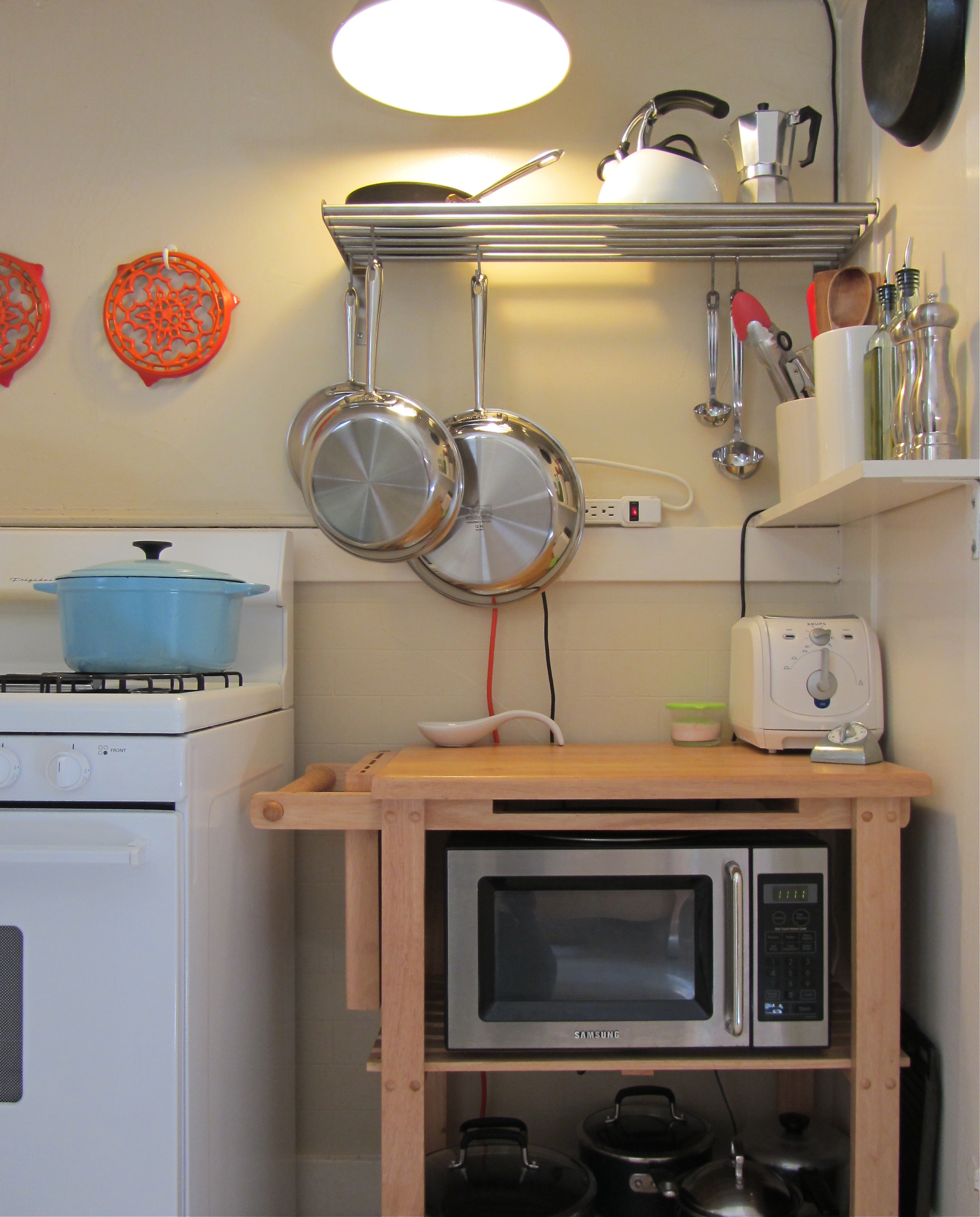 For those of you with an inquiring spirit, here is a snapshot of my cooking workspace. I recently took stock of what I have and the things that I actually use. I did a little bit of planning, and then with a bit of elbow grease, re-organized my work area. What you don’t see is opposite this point of view you will find a medium-sized kitchen island where all prep work is done. As you can see, it is not very spacious. But I do keep it organized. After having spent a good amount of time cooking, I’ve done my best to keep my arsenal of tools at a simplified minimum.