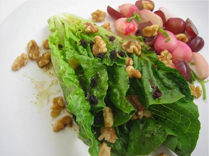 2. Depending on the size of the romaine lettuce head, and the size of salad you want, cut lengthwise in half or quarters. Place lettuce wedge, cut side up, onto serving plate. Sprinkle some walnut and dried currents over it, then drizzle with some extra virgin olive oil and balsamic vinegar. Season with a pinch each of salt and pepper. Serve with the radishes and grapes on the side.