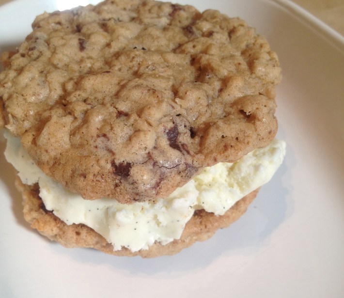 Hello cookie, meet ice-cream. Such a simple collaboration, yet from it comes a wonderful result. This is a self-explanatory recipe, all you need are the two components. As for the flavors? That’s one not-so-simple collaboration for you to decide! (In this instance, I used my oatmeal raisin chocolate cookies and white chocolate vanilla bean ice-cream.)
