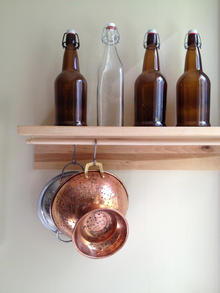 I have a small (24 inches) shelf on my kitchen wall that I use to hold bottles. It works wonderfully well, doubling both as storage and a quaint display above my sink. But then, a little light bulb went on in my crafty brain and I decided that double wasn’t enough, the shelf needed to do triple duty. I’m always on the lookout to maximize storage space, so I had fun with this easy little project. Installing a bar on the underside was a quick and inexpensive way to add an additional feature to the shelf. And being located above the sink, it is the perfect place to hang my colanders!