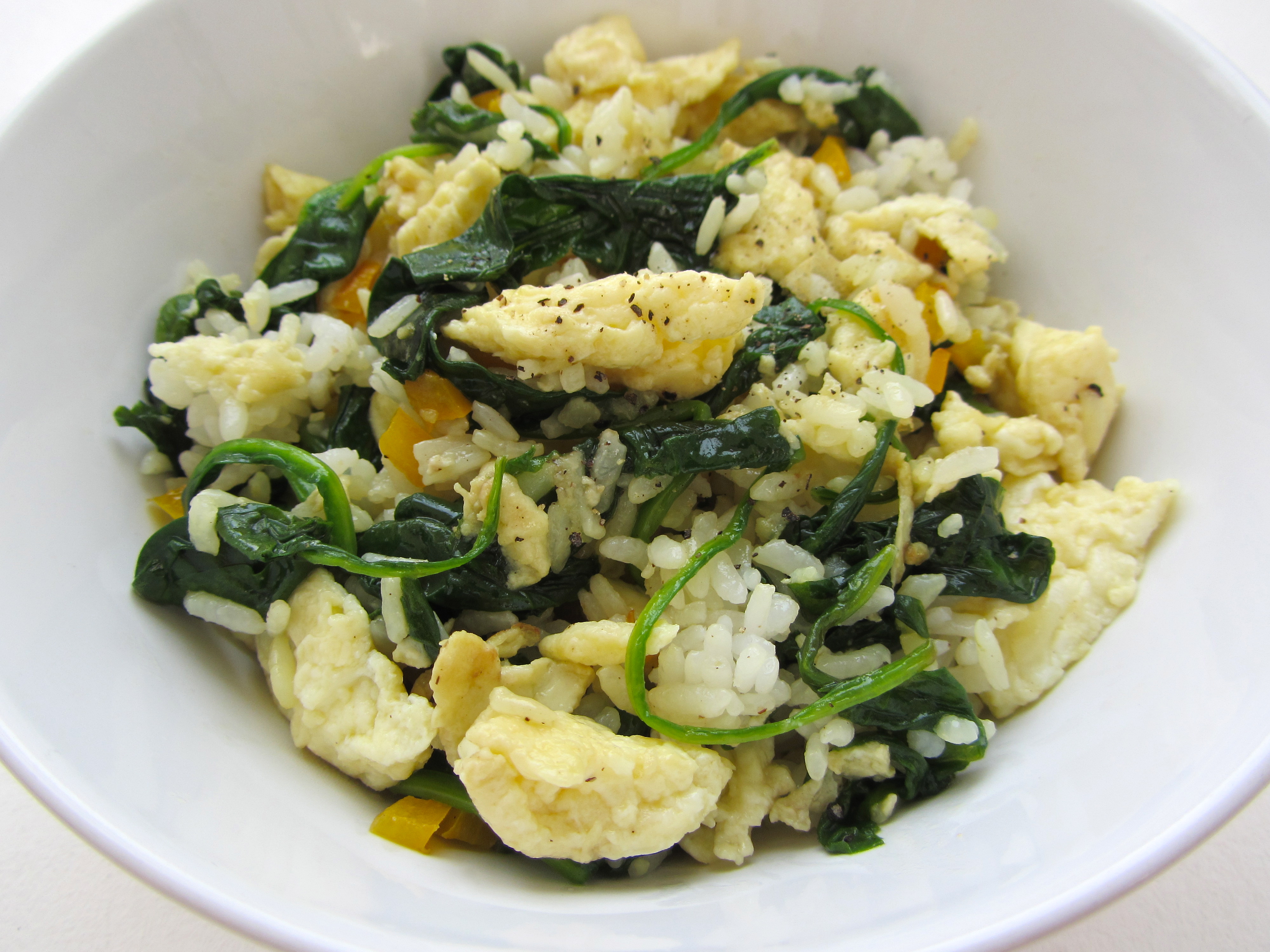 3. Add the rice and spinach to the pan, toss until spinach is wilted. Season to taste with pepper.