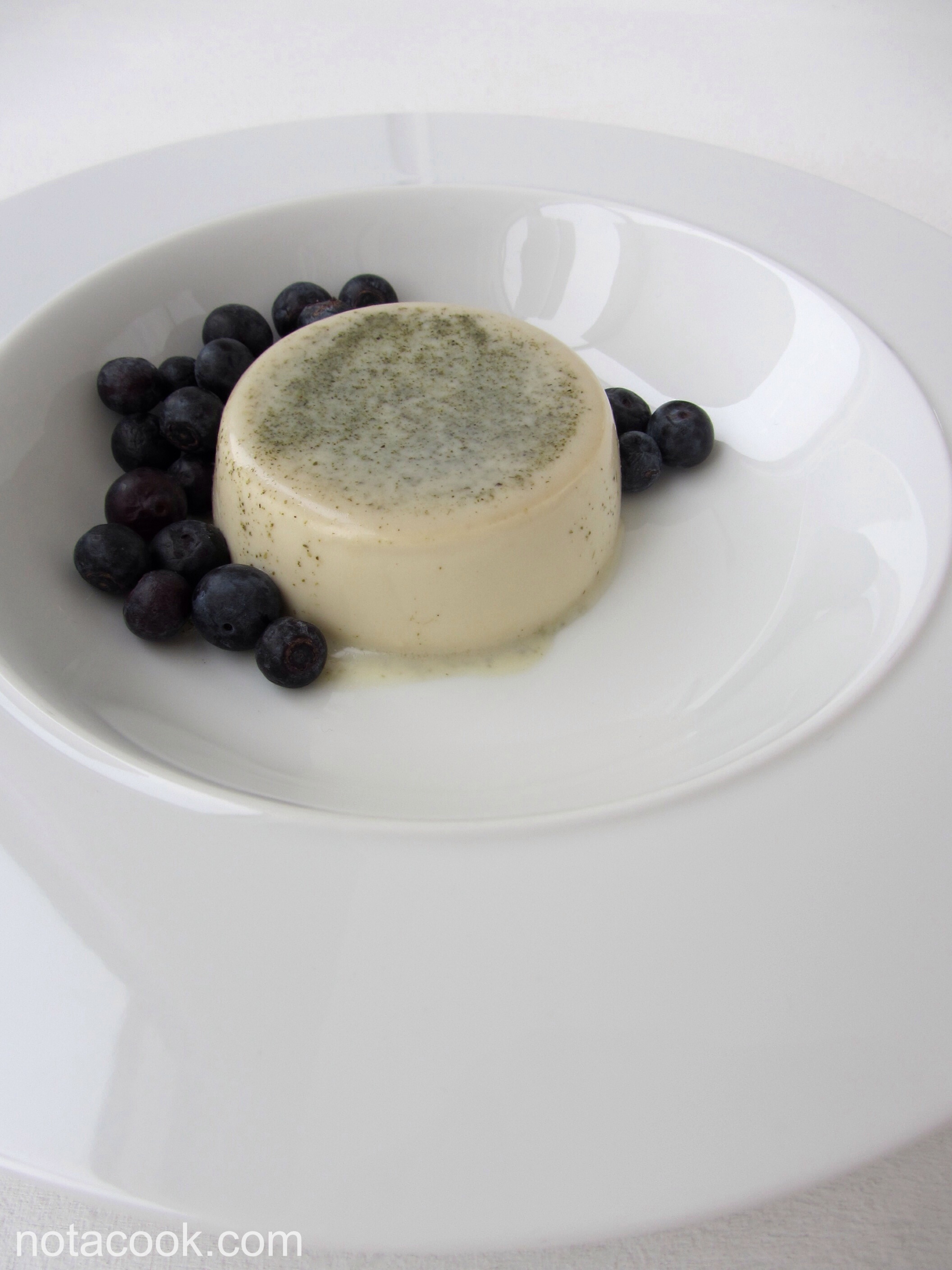 5. When ready to serve, to remove the panna cotta: run a paring knife around the side of each ramekin, then quickly dip them into boiling water. The panna cotta should now be separated from the ramekin when lightly pressed on. Invert them out onto serving plates and serve with the blueberries.