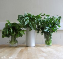 One of my favorite ways to store fresh herbs is in vases on the kitchen counter. Simply rinse the bundle under running water, give it a shake to dry, then trim the ends and place into small containers with water.
